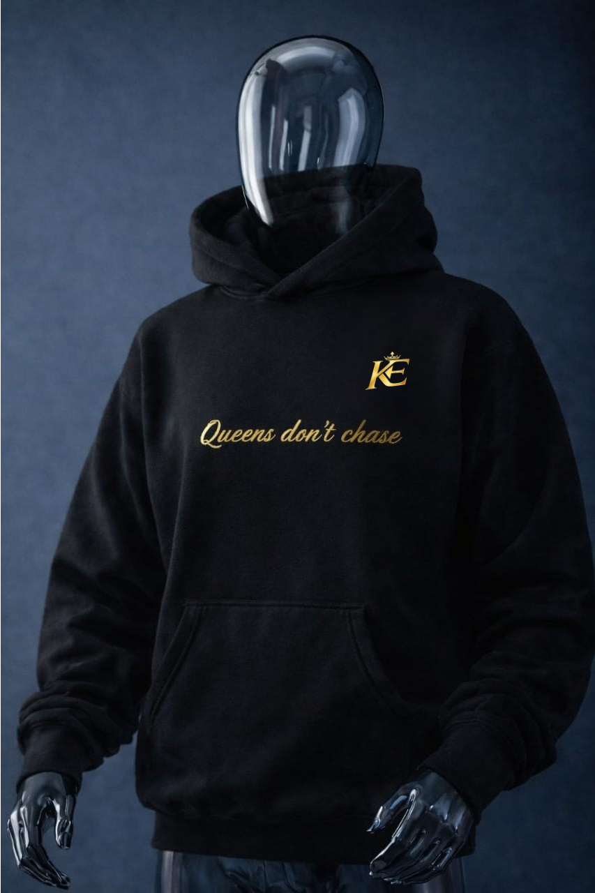 Featuring the iconic KE crowned logo and the empowering statement “Queens don’t chase” in elegant gold embroidery, this piece is a reminder of self-worth, power, and composure. Soft on the skin, structured in fit, and versatile enough for everyday wear, it’s more than a hoodie — it’s a mindset.